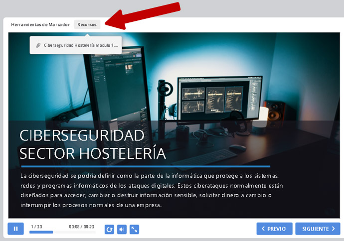 Debemos pulsar sobre el menú RECURSOS y se abre uns pestaña desde la que podemos descargar el contenido en PDF.